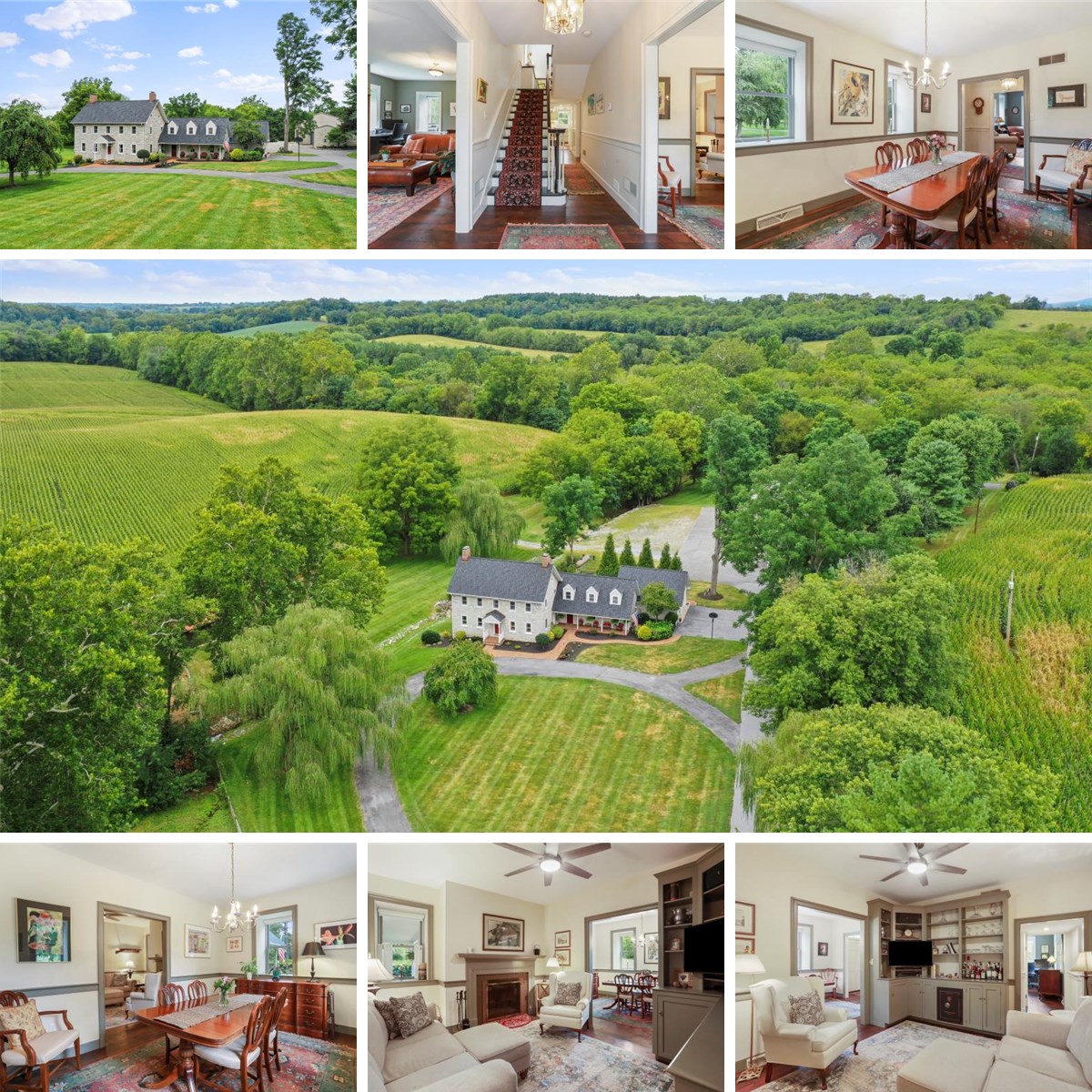 Welcome to an extraordinary opportunity to own a piece of early American history—The Christian Newcomer Home, an exquisite 5-bedroom, 3-bath stone farmhouse dating back to 1795. Nestled on 20 pristine acres, this meticulously maintained estate seamlessly combines timeless craftsmanship with modern luxury. Inside, discover original barnwood flooring throughout, lending warmth and authenticity to every room. The living room and sitting room each feature classic wood-burning fireplaces, perfect for cozy evenings. A formal dining room invites elegant entertaining. A chef’s dream kitchen awaits with a Wolf gas range, Sub-Zero refrigerator, quartz countertops, pantry, island with breakfast bar, and additional casual dining space—seamlessly connected to a large family room for easy everyday living. Two separate staircases lead to the second level, offering access to three spacious bedrooms. The luxurious primary suite includes its own gas fireplace, private entrance to an oversized walk-in closet room and a spa-style bath with jetted tub, double sinks, and separate shower. The third floor offers two additional bedrooms, perfect for guests, office space, or a quiet retreat. A screened-in porch leads to a hardscaped patio and in-ground pool—an idyllic setting for relaxation or entertaining. Adding to the charm, a natural spring runs through the basement, creating a truly unique and rare natural feature. Additional property highlights include: A massive 2-bay barn converted into office space with two private rooms, storage, and an attached 2-car garage. Separate corn crib and donkey barn. A charming 3-bedroom, 2-bath tenant house perfect for guests, rental income, or multigenerational living. With unmatched historical significance, luxurious finishes, and stunning surroundings, this one-of-a-kind estate invites you to live a life of timeless beauty and comfort.